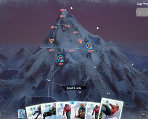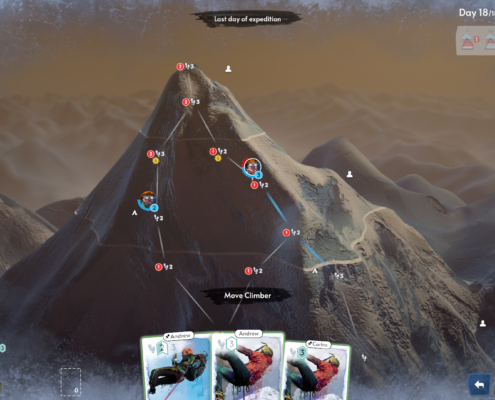 Każda góra to kilka stref, im wyżej tym trudniej. Początek wyprawy to doprawdy sielanka, prawie każde pole, na którym się zatrzymamy dostarcza nam dodatkowych punktów życia. Punkty akcji, które otrzymamy z kart pozwalają nam w zależności od karty albo się wspiąć, albo zejść niżej. Ważne jest to, że cały czas kontrolujemy obu wspinających się alpinistów. Musimy więc mądrze dobierać karty i rozdzielać punkty między dwie postacie. Im wyżej tym pola na których stajemy przestają nam dawać bonusy, a zaczynają wręcz odbierać nam życie, za każdą rundę na nich spędzoną.